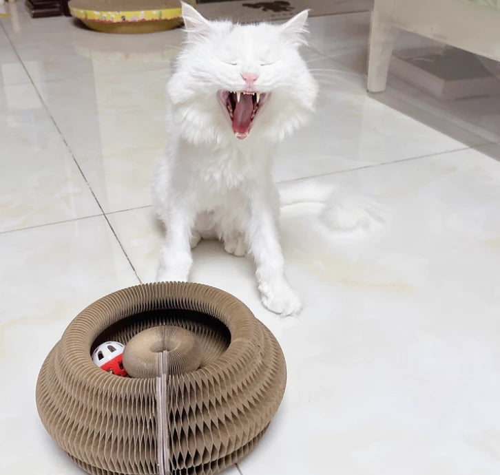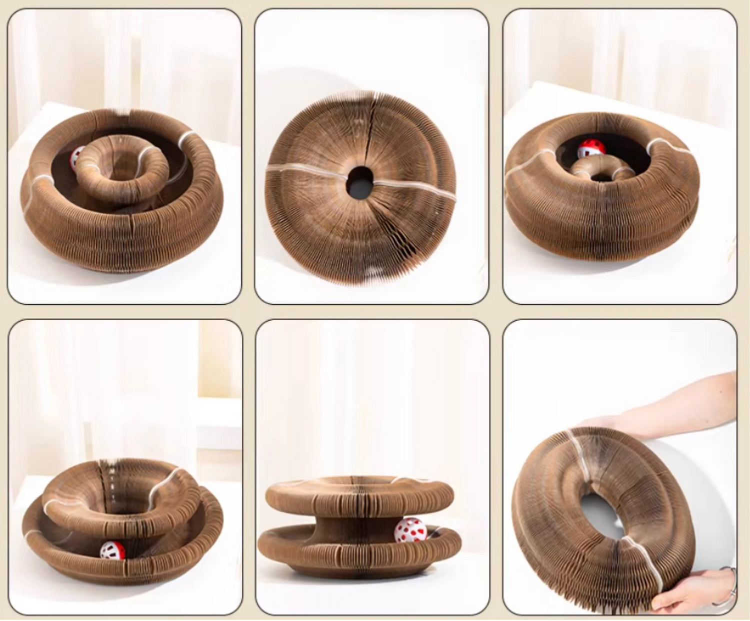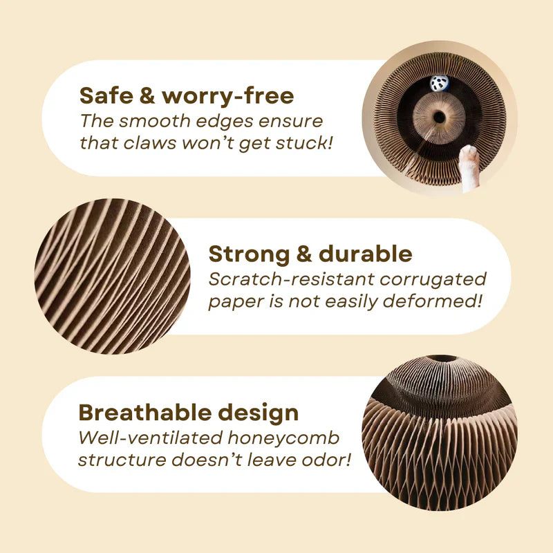 PAWVVY combines interactive play with natural scratching satisfaction. The accordion-style cardboard design features a built-in track with rolling bell balls that create unpredictable movement as your cat swats and pounces.